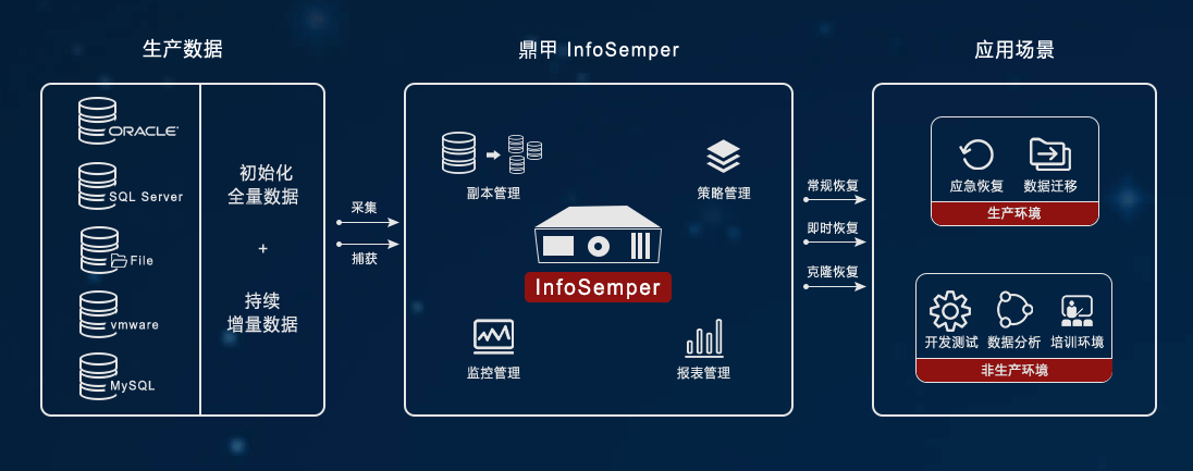 InfoSemper 通過(guò)“黃金副本”技術(shù),結(jié)合脫敏、克隆、增量合并等監(jiān)控管理手段,可支持生產(chǎn)環(huán)境的數(shù)據(jù)保護(hù)和應(yīng)急,又可滿足非生產(chǎn)環(huán)境的開發(fā)、測(cè)試、數(shù)據(jù)分析等場(chǎng)景。為企業(yè)來(lái)帶額外的數(shù)據(jù)價(jià)值,同時(shí)大大降低了企業(yè)運(yùn)維人員的工作壓力。
