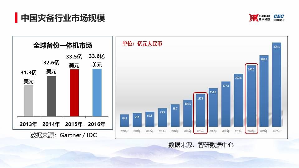 關于中國災備行業市場規模,我們可以看到權威機構預測,到2020年,也就是今年,大概會有240.5億人民幣這樣的一個市場規模,且每年保持20%左右的增長。