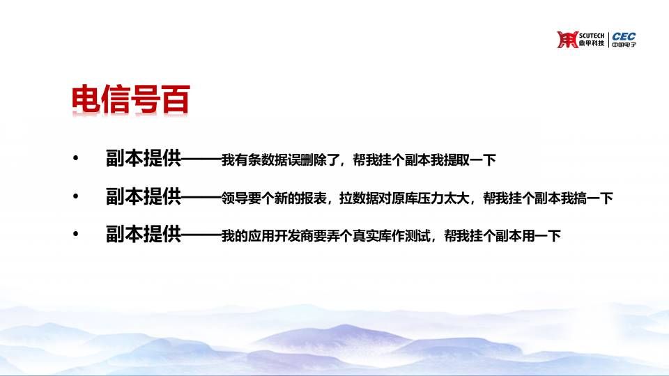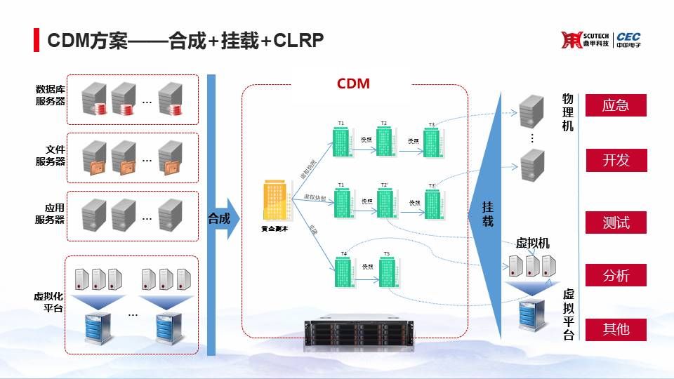 那么根據(jù)這個CDM的情況呢,我們設計了一些方案場景,就是我們在想像中的場景,我們今天的主題叫想象與真實嘛,那我們想象中的場景是怎么樣的?是我們獲得黃金副本之后進行若干個快照的掛載,去支持這些應急、開發(fā)、測試分析等等一些其他的業(yè)務。