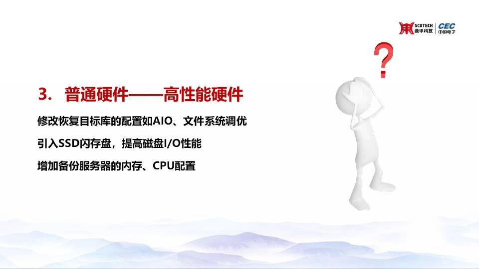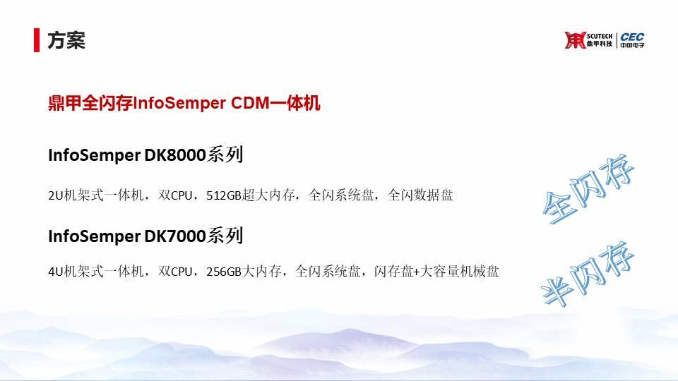 然后我們在鼎甲的這個CDM的一體機,硬件上也做了一些優(yōu)化,比如說我們推出了DK8000系列的全閃存的一體機。包括了是全閃的系統(tǒng)盤啊,全閃的數(shù)據(jù)盤,大大的提高了我們磁盤的IO,還有就是針對一些大容量的大數(shù)據(jù)量的這個用戶的情況,我們的CDM也提供了4U的這種DK7000系列,我們叫它半閃存盤。其實根本目的也是用來提高我們的磁盤的IO,提高磁盤IO以后就可以提高整個掛載恢復回滾日志的速率。