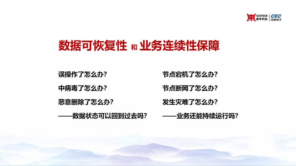 第一部分,你從哪里來,我的CDM。我們講CDM從哪里來主要要回到我們整個災備行業(yè)的兩大基本需求,災備行業(yè)最重要的兩個需求,它都是來自于一些災難性的場景,那么我們看一下到底有一些什么場景。比如說誤操作、中病毒,又比如惡意刪除、刪庫跑路這種。當發(fā)生這些,我們叫數(shù)據(jù)上的邏輯錯誤的時候,我們需要把這個數(shù)據(jù)狀態(tài)調(diào)回到?jīng)]有發(fā)生這些錯誤之前。