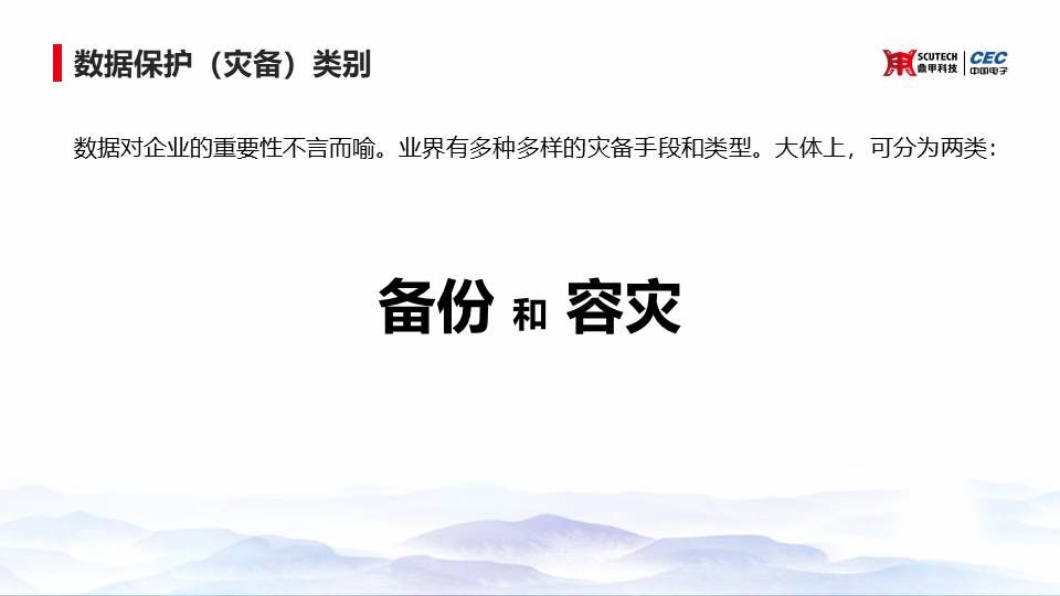 這是災備行業(yè)的第二個問題,那么這兩個問題其實是兩個需求的核心,一個是數(shù)據(jù)可恢復性,一個就是業(yè)務的連續(xù)性的保障。面對這兩個核心的需求,我們?yōu)膫湫袠I(yè)的廠商是做了很多工作,主要的內(nèi)容就是備份和容災。也就是說,備份和容災其實是兩件不同的事情。