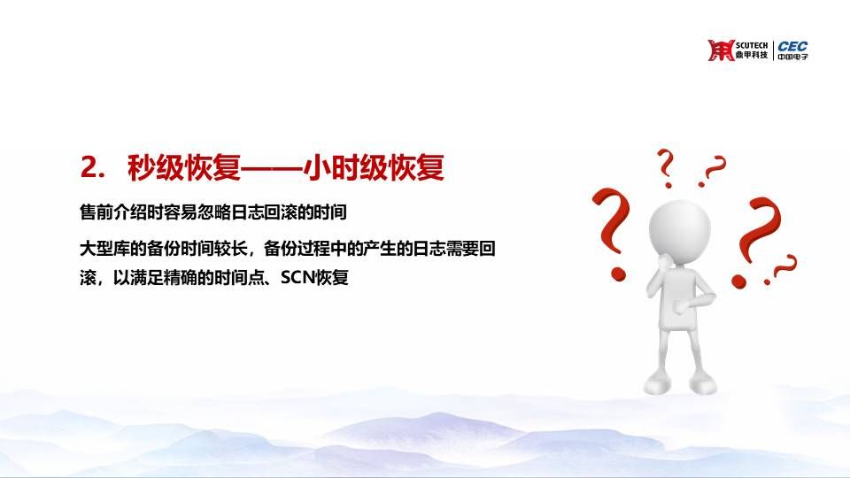 第二種這個想象與現(xiàn)實的差距就是你的售前介紹的時候秒級恢復,實際上秒級恢復是很難去做到,因為它有一個日志回滾的時間,就說我們在售前介紹時經(jīng)常會去忽略掉這個日志回滾的時間。大型庫的備份時間較長,備份過程中的產(chǎn)生的日志需要回滾,以滿足精確的時間點、SCN恢復。