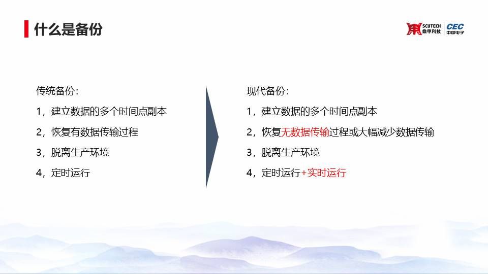 備份做了一些什么事呢?我們看一下備份的特點。備份主要是建立一個數(shù)據(jù)的時間冗余,它的數(shù)據(jù)恢復都會有數(shù)據(jù)的傳輸過程,而且這個數(shù)據(jù)的存放一定是脫離生產(chǎn)環(huán)境的,它是不能放在生產(chǎn)環(huán)境內(nèi)部的。