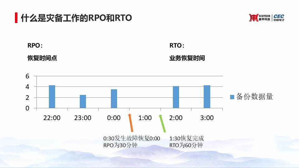 那么在災備工作上還有兩個非常重要的指標,就是RTO和RPO。RTO是業(yè)務恢復時間,RPO是恢復時間點。