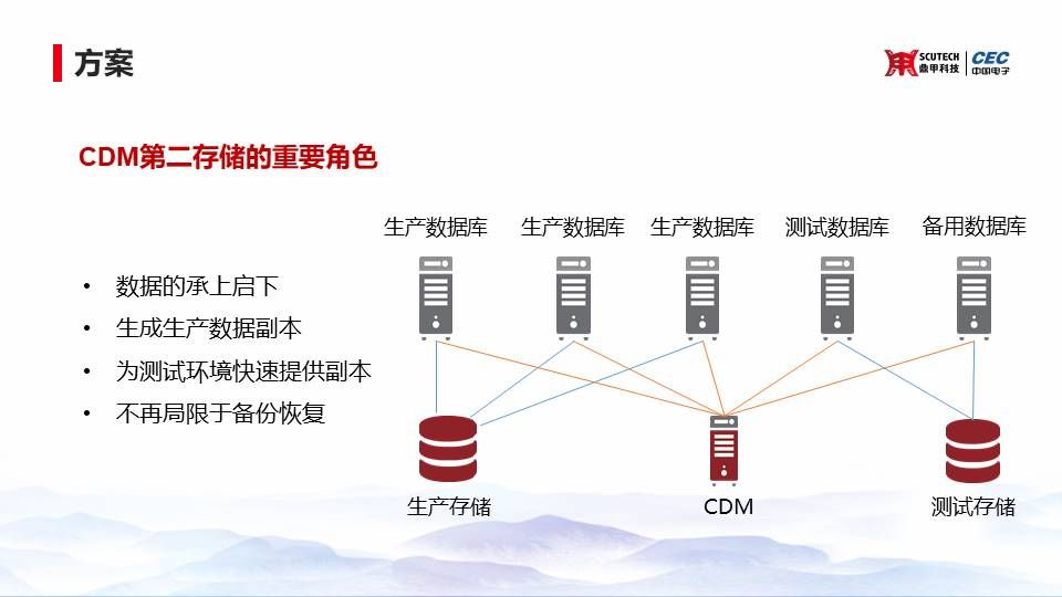 第二種方案呢,我們CDM在整個的基礎架構中扮演的角色,我們?nèi)ネ诰蛞幌碌诙鎯Φ囊粋€重要角色。那么在這個過程中,其實CDM這個系統(tǒng)和生產(chǎn)測試用的存儲是在同一個層面的。從生產(chǎn)數(shù)據(jù)到測試數(shù)據(jù),這么一個轉換過程是通過CDM可以去做一個數(shù)據(jù)的承上啟下,通過CDM可以去做一個生產(chǎn)數(shù)據(jù)的副本,快速為測試數(shù)據(jù)提供副本。