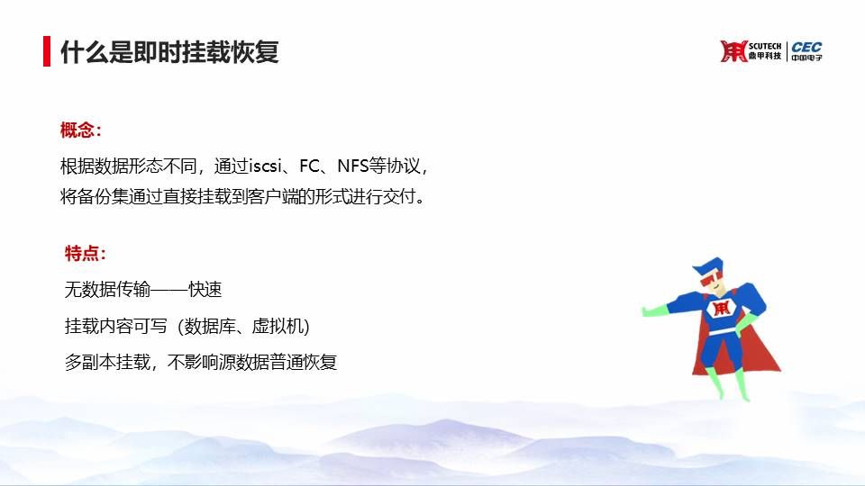 第二個核心技術點就是合成備份,合成備份最重要的一個優(yōu)點就是它是一個永久的增量備份。我們可以看下面這個圖,每一塊紅色的都是指那個初始的全量備份,每個初始的全量備份加上當前的這個綠顏色的增量數(shù)據(jù)之后,可以組合成為一個新的全量數(shù)據(jù),就是后面的藍色這個方框。每一個藍色方塊都成為一個塊狀的形態(tài),存在我們的CDM服務器里面。那么這些藍色的方塊兒可以去干什么?可以去做一個掛載恢復,那么就引入了我們第三個核心的技術叫做即時掛載恢復。