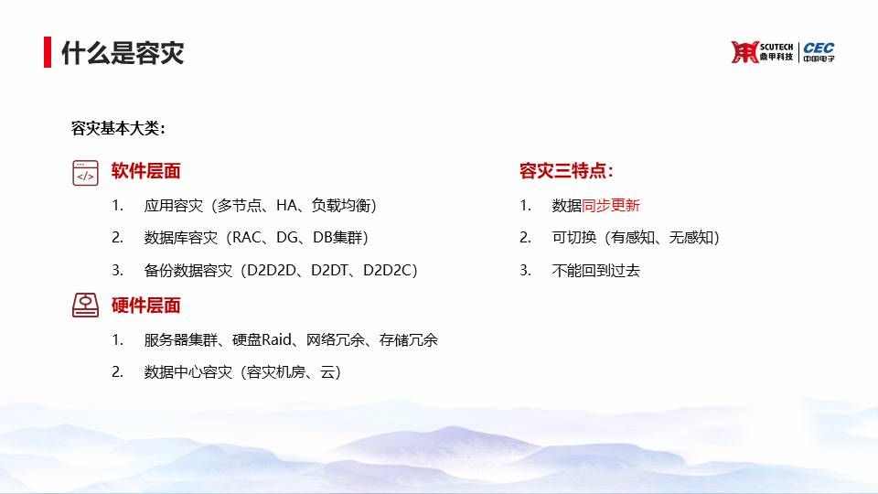 那么什么是容災呢?我們顧名思義它是災難的冗余嘛,在災難來臨的時候,我們不至于說整個業(yè)務沒有辦法進行了。容災這件事情它有三個非常突出的特點,第一個容災的數(shù)據(jù)它是同步更新的,一旦你在一個節(jié)點上刪除了一個數(shù)據(jù),那么其他節(jié)點相應的數(shù)據(jù)也就跟著刪除了。