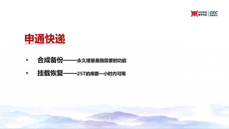快遞公司它們數(shù)據(jù)庫的體量是非常龐大的,它主要是要做合成備份,做合成備份的目的是它沒有辦法周期性的做全量備份。因為它一旦做全量備份相當于他這個數(shù)據(jù)庫的使用幾乎要停止,所以一定要做永久的增量備份。此外,它還有一個25T的數(shù)據(jù)庫,當它要去生成一個測試庫的時候,它需要CDM去做掛載恢復。