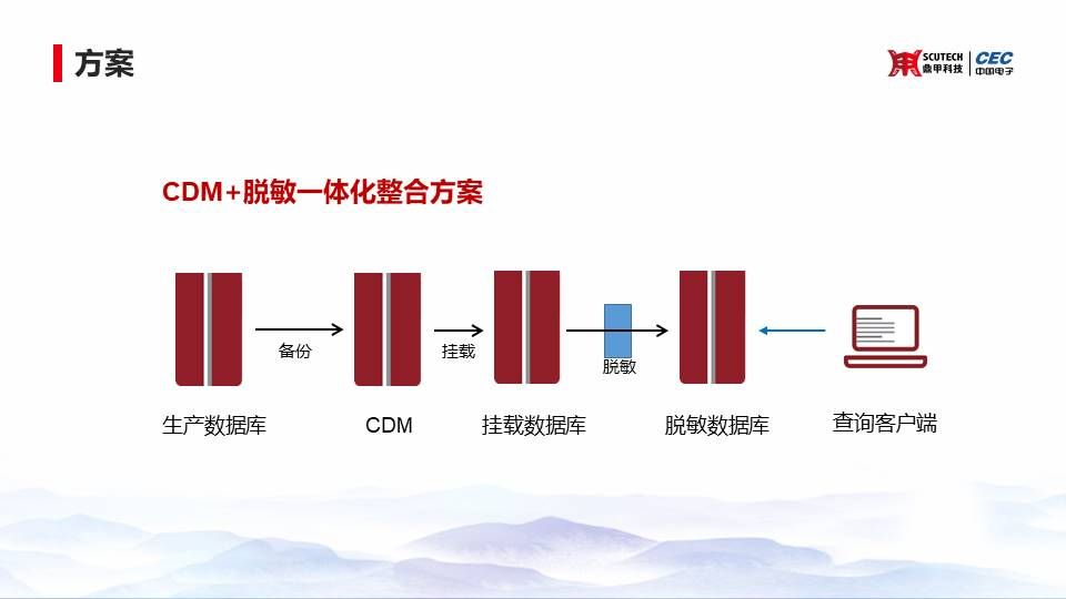 最后我講一下當我們遇到了這些想象和現(xiàn)實的差距之后,鼎甲對我們CDM的產(chǎn)品在未來做了一些什么樣的展望?下面這是一個方案,我們把CDM和脫敏去整合到一起。整合到一起之后呢,也就是說將脫敏這件事情,也是離開了生產(chǎn)庫。在做脫敏抽取數(shù)據(jù)和運算的這個過程,是不需要生產(chǎn)庫的參與。所以就把脫敏這件事情離你生產(chǎn)更遠,對你生產(chǎn)就沒有任何的影響,通過CDM和掛載數(shù)據(jù)庫來實現(xiàn)這么一個脫敏的工作。最終用戶是通過查詢客戶端直接去查詢這個脫敏的數(shù)據(jù)庫就可以了。