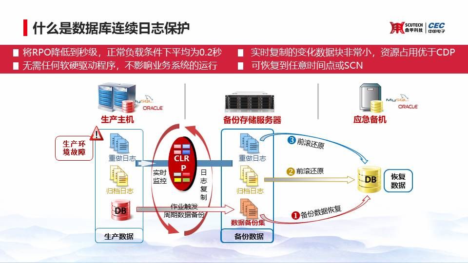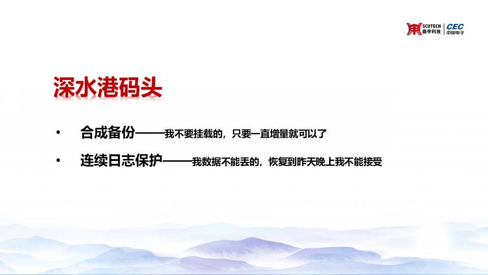 在這些概念的基礎上,CDM是如何來的呢?CDM一共有三個非常核心的技術。第一個是連續(xù)日志保護,通過一個定時的數(shù)據(jù)備份,再加上我們實時的連續(xù)日志保護,可以將數(shù)據(jù)庫的數(shù)據(jù)非常完整的去保存。它和CDP有一個本質(zhì)的區(qū)別,就是我們備下來的每一個日志都是能保證它是可恢復的。