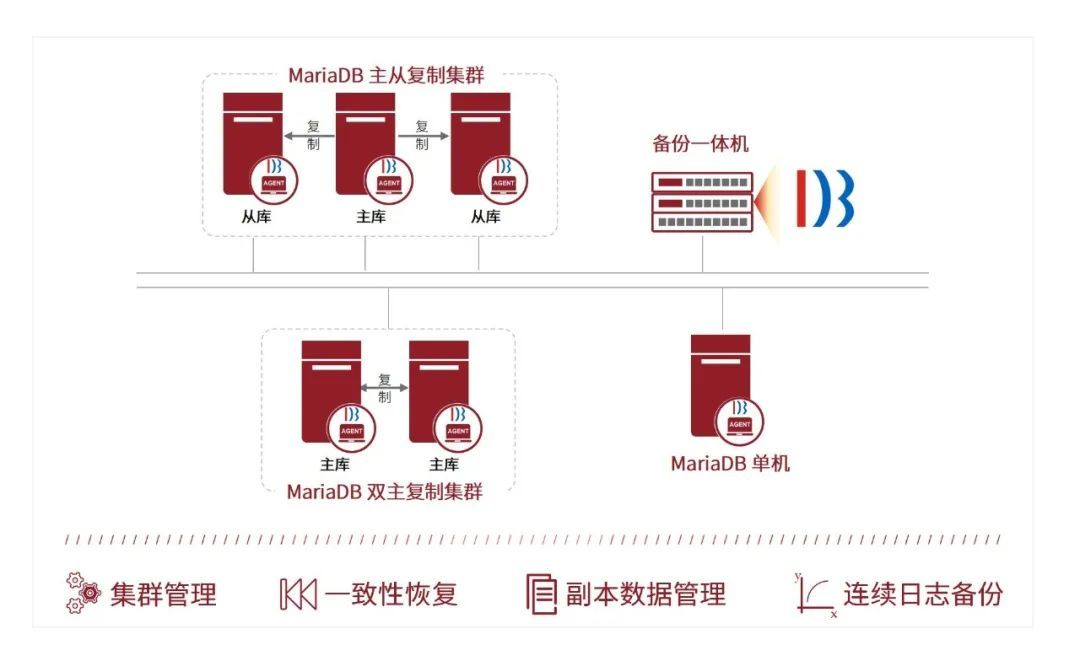 在支持單機 MariaDB 的基礎上,迪備(DBackup)新版本新增對 MariaDB 主從復制和雙主復制集群架構的邏輯和物理備份恢復,實現MariaDB 指定 GTID 的物理恢復,為客戶打造安全可靠、全面高效的數據保護解決方案。