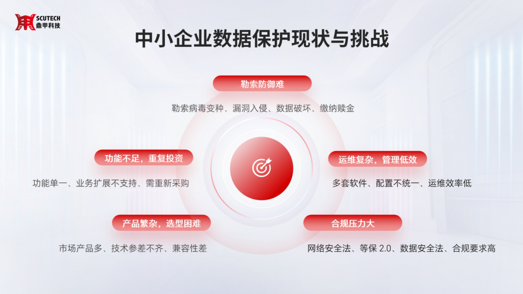 隨著數字化轉型的深入,中小企業面臨的挑戰愈加突出:勒索病毒頻發,數據安全岌岌可危;市場產品繁雜、兼容性參差不齊;運維力量有限,難以承擔復雜的配置和維護;合規壓力不斷增加,但缺乏專業團隊支撐。許多企業在采購過程中,不得不在“成本可控”與“安全合規”之間艱難權衡。
