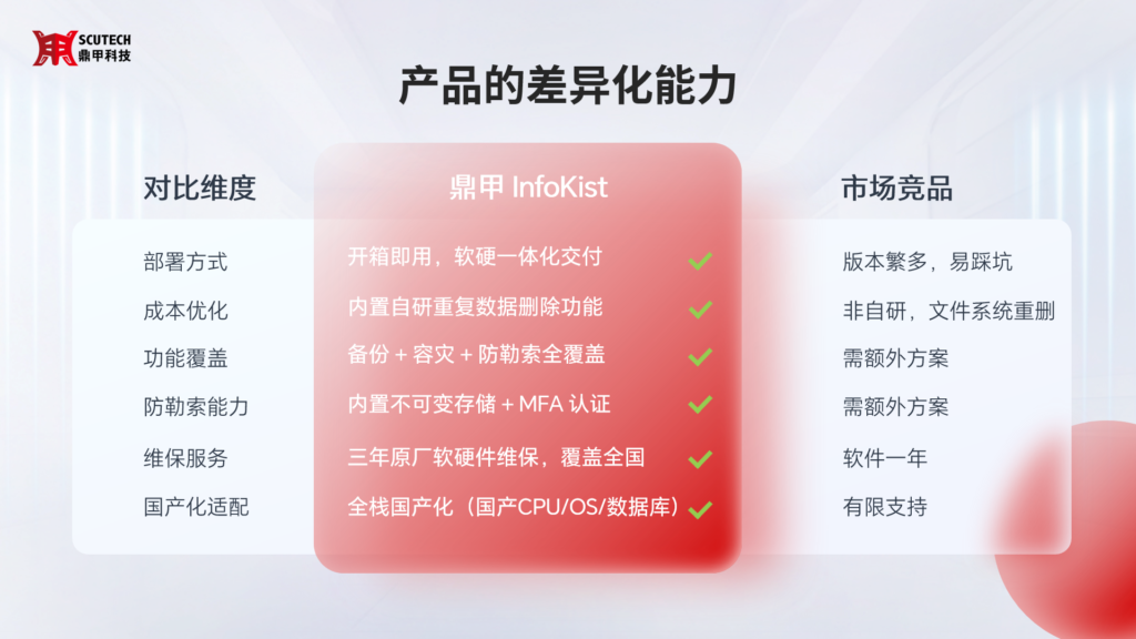 在大型企業級市場積累的技術沉淀和規模化應用,也成為鼎甲此次產品的獨特優勢。例如,自主研發的重復數據刪除技術幫助企業節省存儲成本,同時保持高效容錯減少備份用時;多層次防勒索保護機制確保備份數據“不可識別、不可篡改、不可刪除”,確保數據的固若金湯;而廣泛的兼容性則讓產品同時支持國產 CPU、國產操作系統、國產數據庫和國產虛擬化環境,幫助企業在信創環境下也能穩定運行。