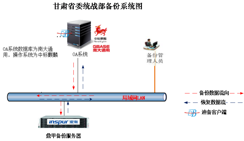 在甘肅省委統(tǒng)戰(zhàn)部OA系統(tǒng)上部署鼎甲迪備備份容災(zāi)軟件客戶端,備份服務(wù)器及存儲(chǔ)介質(zhì)由一臺(tái)浪潮服務(wù)器組成,針對(duì)國(guó)產(chǎn)中標(biāo)麒麟操作系統(tǒng)、國(guó)產(chǎn)數(shù)據(jù)庫(kù)Gbase(南大通用)數(shù)據(jù)庫(kù)分別進(jìn)行全量備份、增量備份。實(shí)現(xiàn)對(duì)于OA系統(tǒng)完整的保護(hù)。