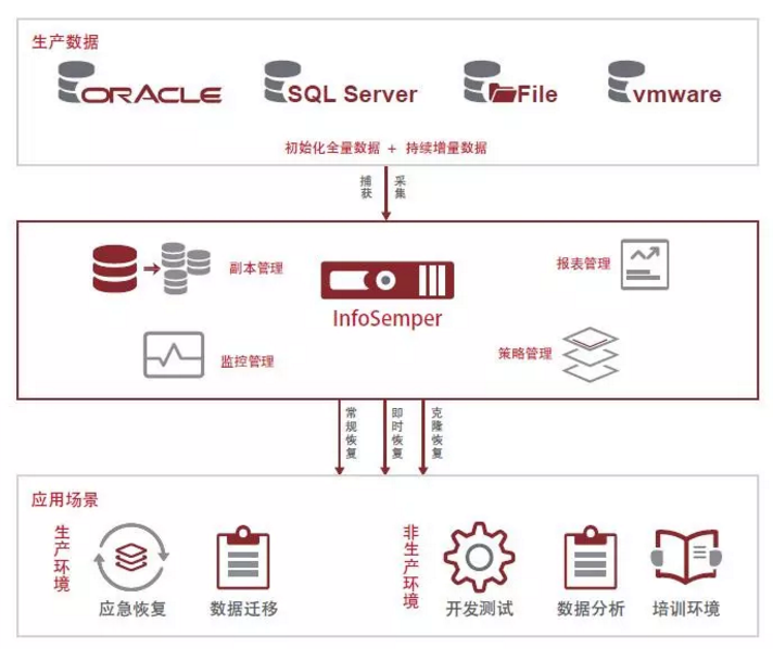 CDM技術借助“黃金副本”等技術,通過增加脫敏、克隆、增量合并等監控管理手段,滿足研發、測試、大數據分析等應用對于數據的需要。